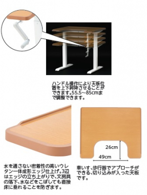 ●大きさ/(W)90×(D)75×(H)55.5~85cm(高さ無段階調節) ●材質/天板:メラミン化粧板・ウレタン一体成形(3方転がり止め付)、脚部:スチール、昇降式 ●天板耐荷重/60kg