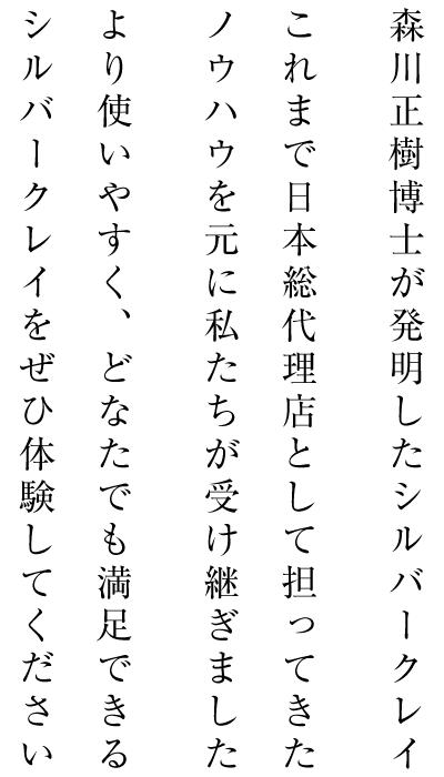 人類の貴金属との付き合いは7,000年に及び、とりわけ銀は生活を飾る貴金属として盛んに使われています。森川博士は、その貴金属を粘土状にし、陶芸感覚で造形するという画期的なアイデアを実現しました。私たちはぜひその想いを新しい純銀粘土に残したいと思いました。
